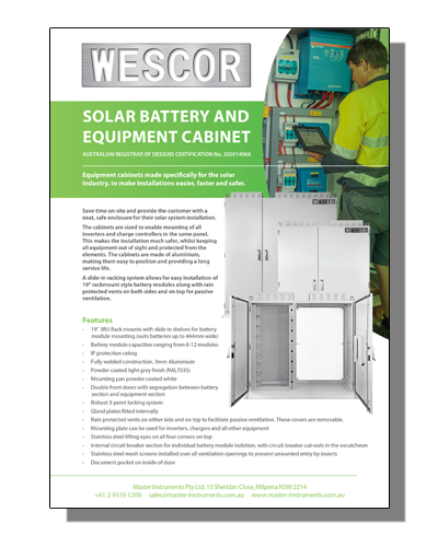 ALS8是Wescor电池和设备柜系列中最小的,最多可容纳8 x 19“3RU机架式电池模块 节省现场时间,为客户的太阳能系统安装提供一个整洁,安全的外壳。 机柜的尺寸使所有逆变器和充电控制器都能安装在同一个面板上。这使得安装更加安全,同时保持所有设备在视线之外,并免受元素的影响。机柜由铝制成,便于定位,使用寿命长。 滑动式机架系统允许轻松安装19“机架式电池模块以及两侧和顶部的防雨通风口,用于被动通风。 特点: